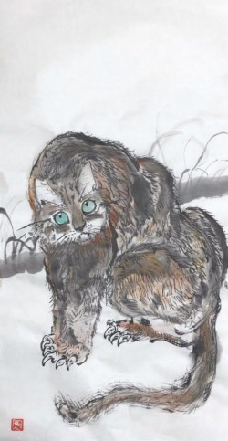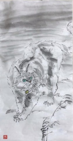花鳥風月でおなじみの雪舟や奇想の画家・曾我蕭白の作品には、圧倒的な表現力を誇る絵師であるにのにも関わらず、疑問に感じる作品があり、画伯曰く、「猫しか見たことがない人が描いた虎」ではないかと推測。これにインスピレーション得て、「虎しか見たことがない人が猫を描いたら」といった作品が出来上がりました。このような視点をもって鑑賞すると、見え方が違って来ますね。